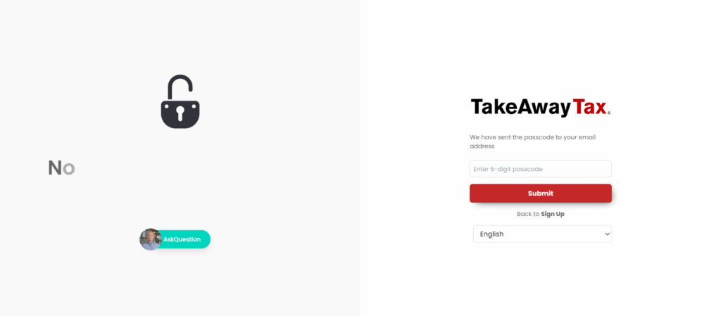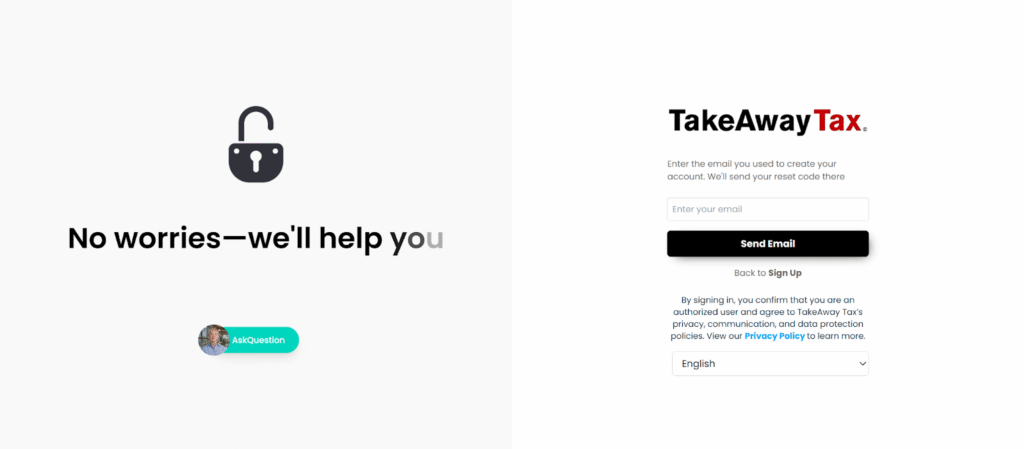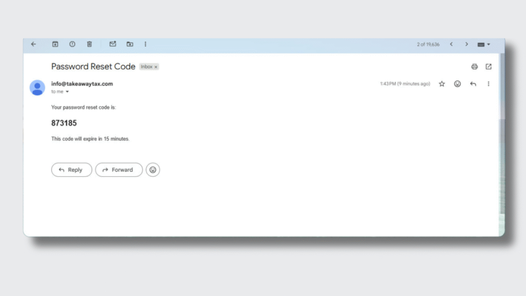 • Open your inbox and look for an email from TakeAway Tax with your password reset code.
