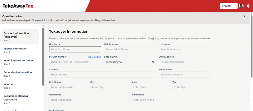 The Questionnaire guides you through everything your Tax Professional will need to start your tax return. Sections include:​
