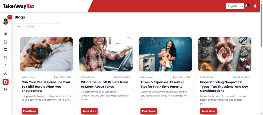 The Blogs section includes educational articles on tax topics such as gig worker taxes, pet-related deductions, new parents, and nonprofits.​