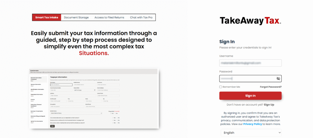 TakeAway Tax Client Portal lets you share tax information securely, track your return, and stay in touch with your tax pro in one place. It is designed as a guided, step‑by‑step experience to simplify even complex tax situations.​